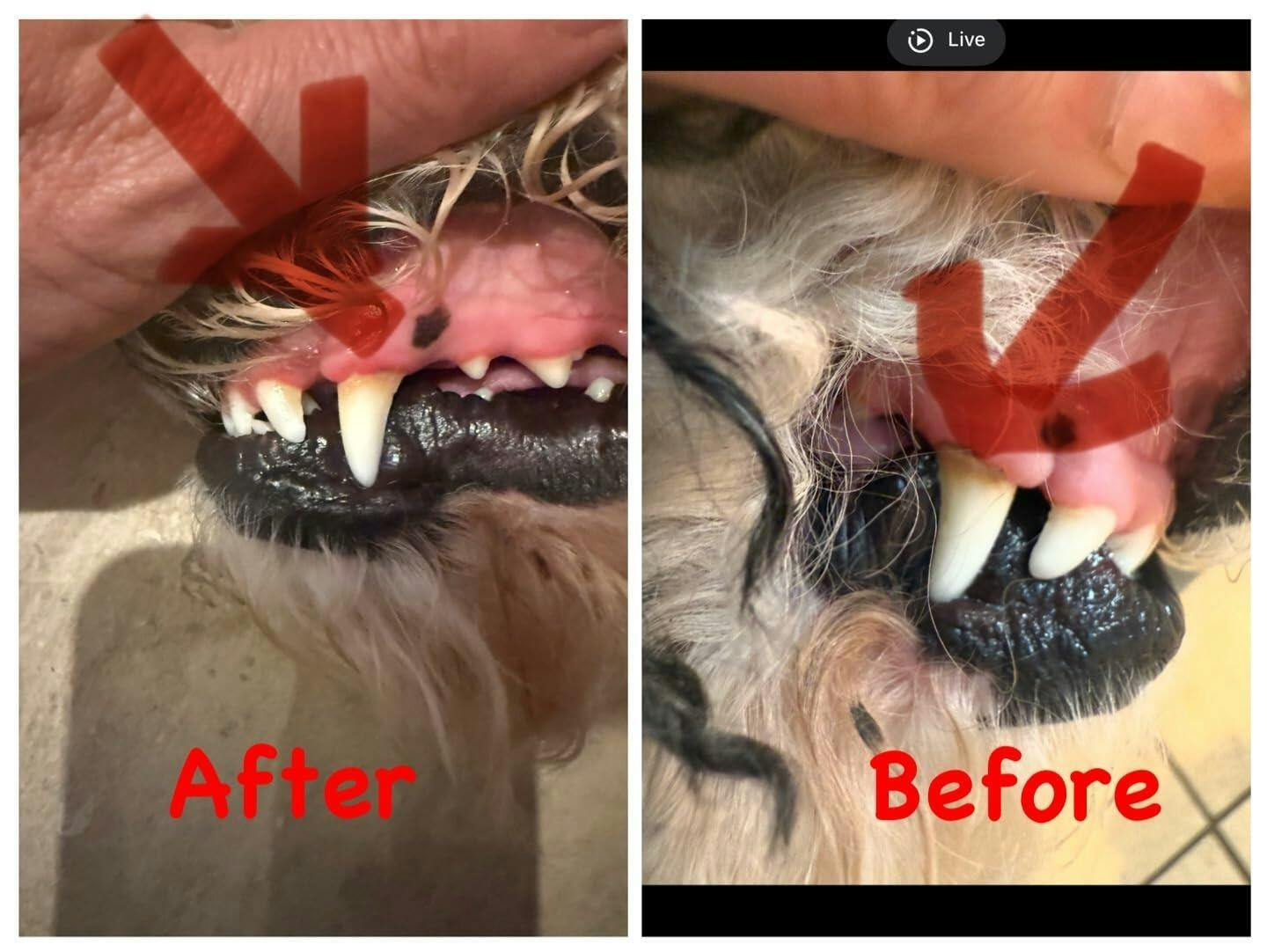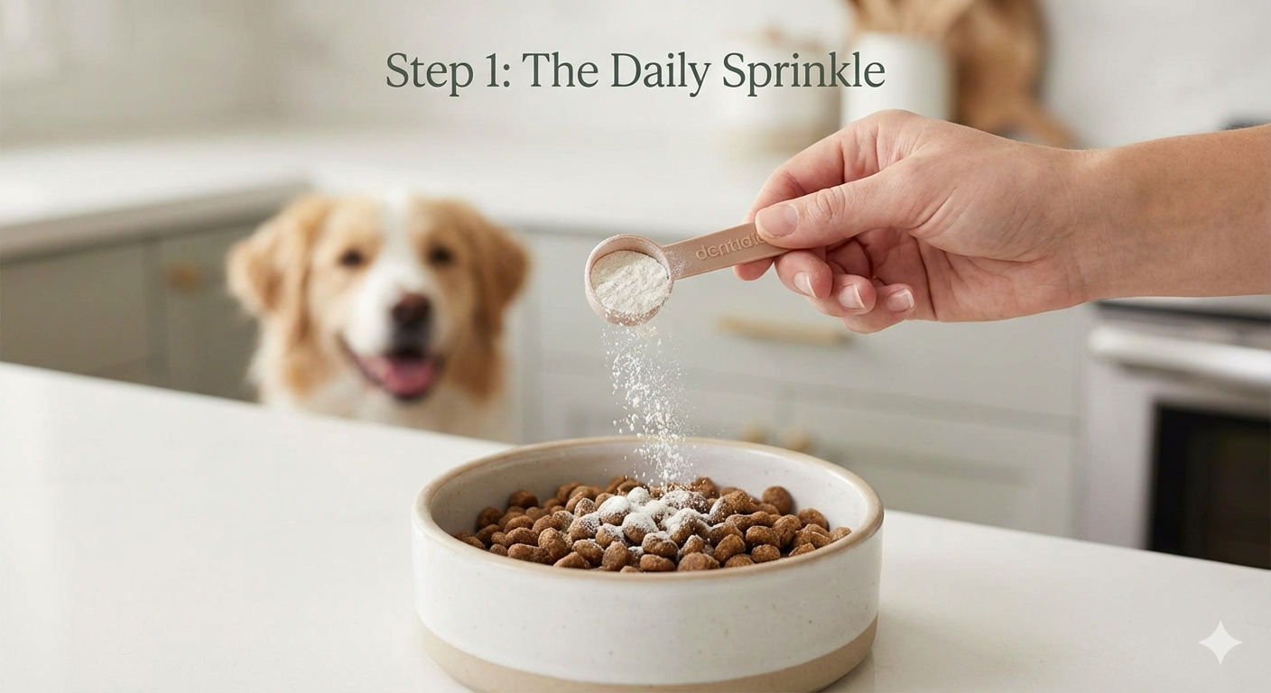 That’s why we created a gentle dental powder you simply sprinkle on your dog’s food once a day. No handling. No stress. No battles.
