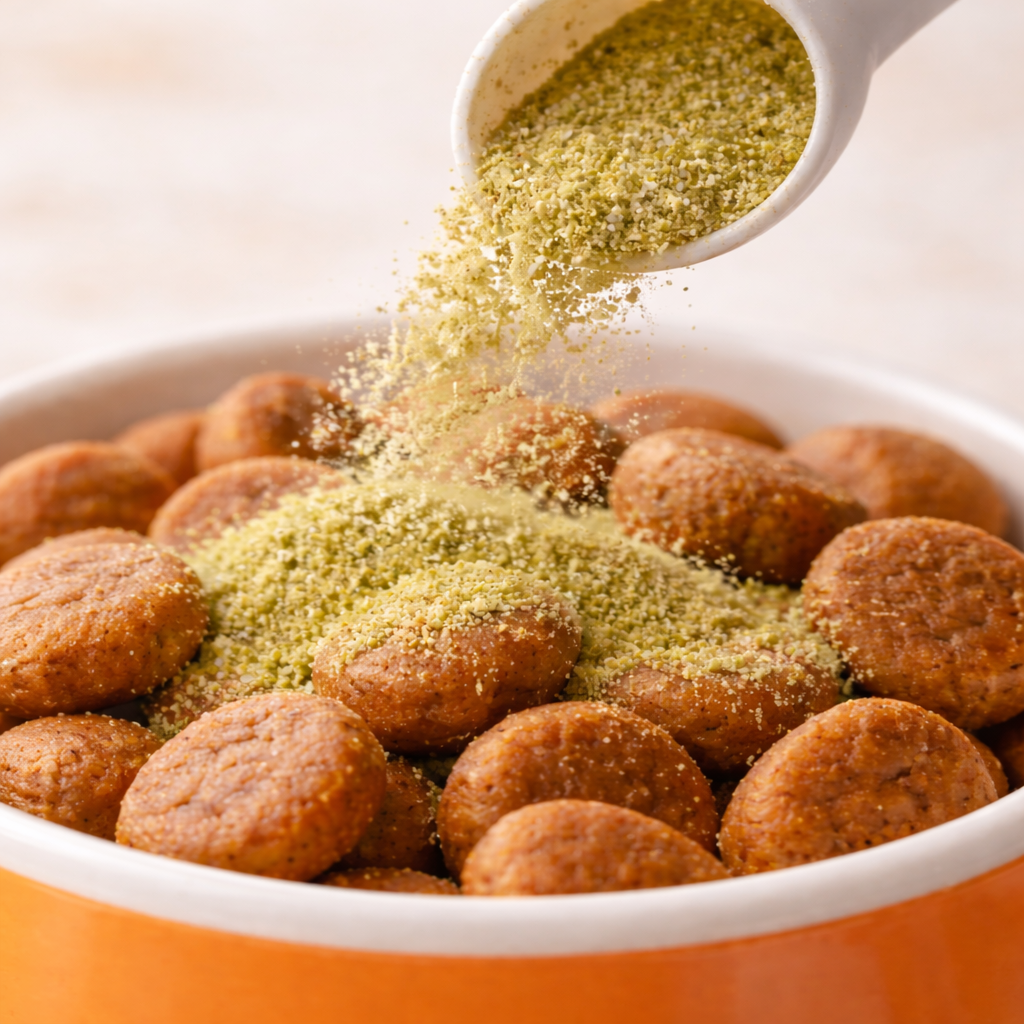 The powder is designed to blend easily into food and is generally well accepted by dogs.